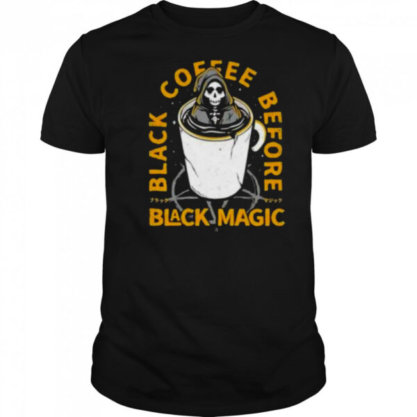 Black coffee before black magic shirt, hoodie, sweater, longsleeve and ladies t-shirt