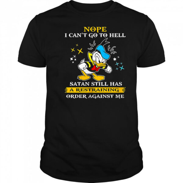 Donald duck nope i can’t go to hell satan still has a restraining order against me shirt, hoodie, sweater, longsleeve and ladies t-shirt