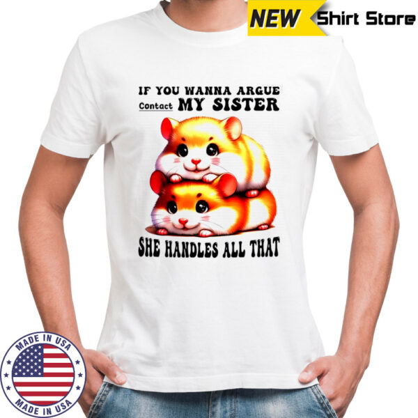 Hamsters are not just pets; they are your tiny balls of fur that bring immense joy and companionship to your life. Imagine coming home to those adorable whiskers twitching in excitement as they eagerly await your attention. These small creatures have a big impact on your mood and well-being. Whether they are running on their wheels or munching on their favorite treats, hamsters if you wanna argue contact my sister she handles all that shirt never fail to entertain and charm you with their playful antics. Their curious nature and quirky behavior make them fascinating pets for both adults and children alike.