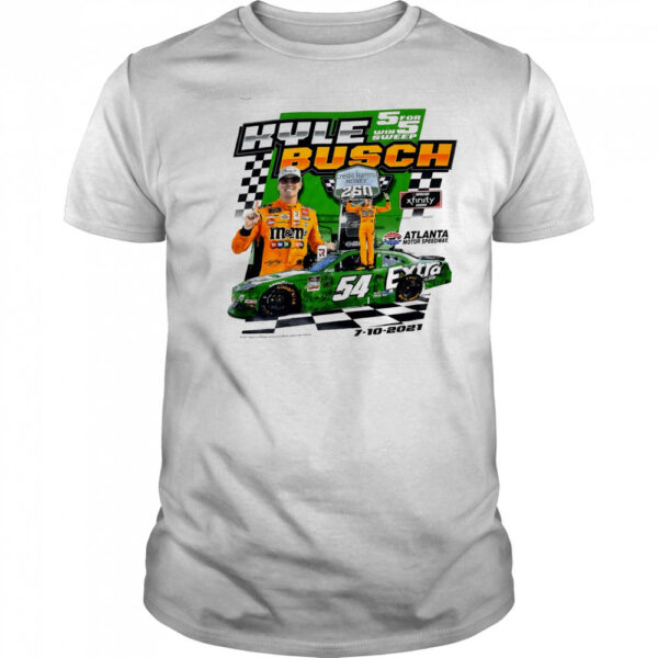 Get ready to show your support and admiration for Kyle Busch with the iconic **Kyle Busch 5 for 5 win sweep Atlanta Motor Speedway Nascar shirt**. Whether you’re at the racetrack, watching from home, or simply out and about, this shirt will make you stand out in the crowd. The vibrant colors and bold graphics pay homage to Busch’s remarkable achievement, evoking a sense of pride and passion in every fan. Don’t miss your chance to own a piece of history and be part of the winning team – grab your shirt today and let the world know you back the best in NASCAR!