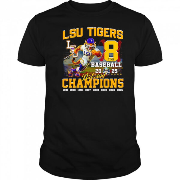 LSU Tigers 8 time National Champions baseball 2025 mascot shirt, hoodie, sweater, longsleeve and ladies t-shirt