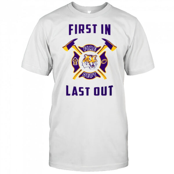 LSU Tigers first in fire dept last out 2025 shirt, hoodie, sweater, longsleeve and ladies t-shirt