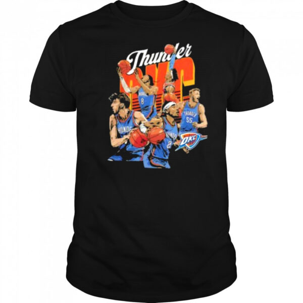 Elevate your fan gear collection with our one-of-a-kind Oklahoma City Thunder basketball starting 5 players team stars caricature shirt. Stand out in the crowd and let everyone know who your basketball heroes are. Not only does this shirt showcase your team spirit, but it also offers unmatched comfort and quality. Made from premium materials, it ensures a soft feel against your skin and long-lasting durability. Whether you’re attending a game at the arena or watching from home, this shirt is your go-to choice. Don’t miss out on the opportunity to own this fantastic piece of memorabilia and support your favorite players in style. Grab yours now and wear your Thunder pride with confidence!