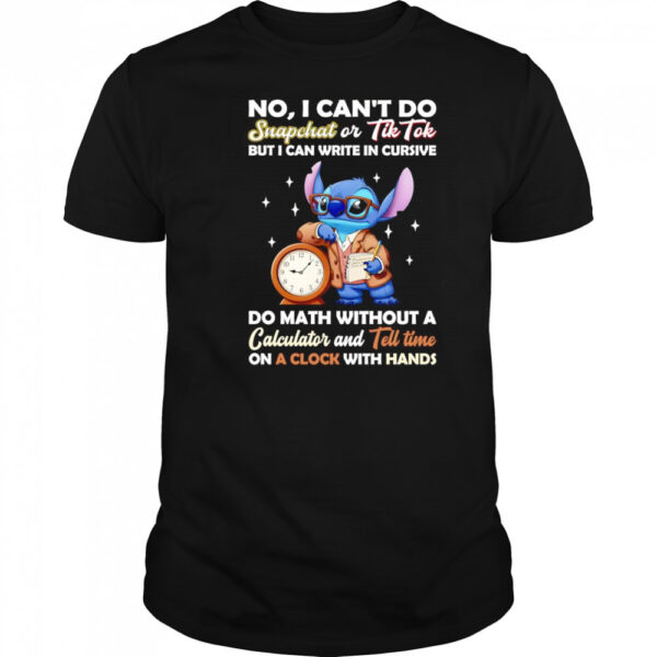 Stitch no I can’t do snapchat or Tiktok but I can write in cursive do math without a calculator shirt, hoodie, sweater, longsleeve and ladies t-shirt
