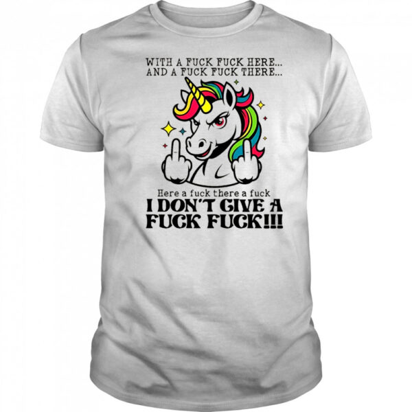 Unicorn middle finger with a fuck fuck here and a fuck fuck there here a fuck there a fuck I don’t give shirt