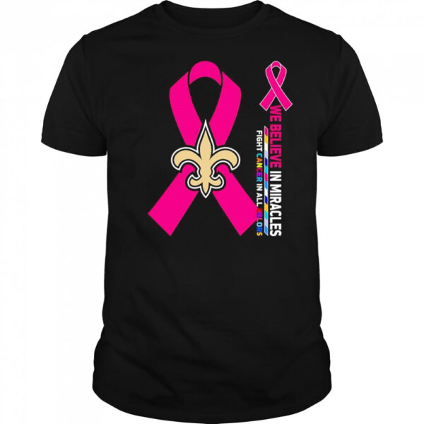 We believe in miracles fight cancer in all colors New Orleans Saints shirt, hoodie, sweater, longsleeve and ladies t-shirt