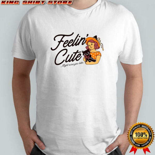 Embrace your inner sorceress and make a statement this Halloween season with our Witch holding black cat feelin’ cute might curse you later Halloween shirt. Don’t miss out on the chance to add this unique piece to your wardrobe and stand out from the crowd. Whether you’re attending a costume party or simply want to add a touch of magic to your everyday style, this shirt is the ultimate choice. Let your outfit reflect your personality and showcase your love for all things mystical and mysterious. Elevate your Halloween look and unleash your inner enchantress by getting your hands on this must-have shirt today!